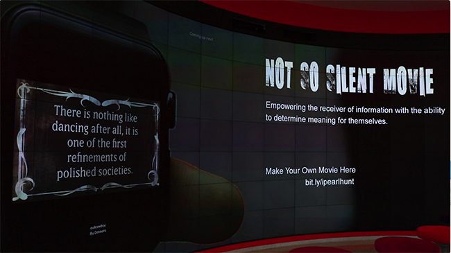 Visitors walking through the second floor entrance of Hunt Library are greeted by the iPearl Immersion Theatre that shows a wide variety of exhibits provided at NC State. One of the newest additions to the theatre is a collaborative exhibit that combines art, design, and computer science - the Not So Silent film project. Professors, students, and faculty worked together to create the progressive exhibit.Everyone using the exhibit begins with the same content: clips of black and white American Western films, and Pride and Prejudice title cards. After considering the clips, visitors are able to assemble them any way they want to create their own story. Once these sequences of clips are gathered from visitors, analysis is done to eventually train algorithms that could combine small units of narrative to create richer stories.