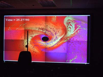 The visualization display wall allows researchers to view large-scale, time-dependent data as color-coded visual simulations of complicated processes, such as plotting physically similar documents close to each other given certain parameters and by doing so discover trends within a text collection that are difficult to discover through traditional means. It is real-time interactive, allowing for six-degrees of freedom navigation through and around millions of documents at beyond 30 frames/second.
